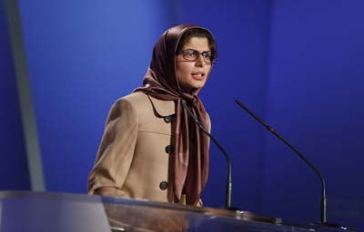 Je viens des rues débordantes de tristesse et d’oppression d’Iran, je viens du milieu des grues d’exécution. Je suis venue à vous avec un sac rempli des souffrances du peuple iranien, en particulier de la souffrance des femmes et des filles de notre pays. Mais aussi un sac rempli de salutations et d’espoirs du peuple opprimé d’Iran. Je suis venue du milieu des étudiants combattifs qui refusent l’indignation. J’ai des messages qui vous sont destinés. »