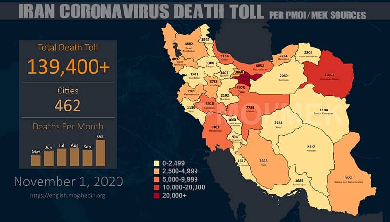 L’Organisation des Moudjahidine du peuple d’Iran (OMPI / MEK) a annoncé le 1er novembre 2020 que le coronavirus a fait plus de 139.400 décès dans 462 villes à travers l’Iran. Le bilan des décès dans les différentes provinces est le suivant : 33.781 Téhéran, 10.577 Khorassan Razavi, 8303 Khouzistan, 7739 Ispahan, 6052 Mazandaran, 5918 Lorestan, 5186 Guilan, 4882 Azerbaïdjan oriental, 4097 Azerbaïdjan occidental, 3860 Alborz, 3761 Golestan, 3725 Hamedan, 3663 Fars, 3656 Sistan-Baloutchistan, 2491 Kurdistan, 2241 Yazd, 2227 Kerman, 2102 Markazi, 2062 Semnan, 1617 Bouchehr, 1548 Ardebil et 1407 Qazvine.