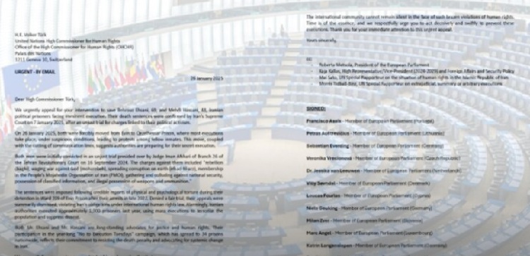 Dans une lettre puissante adressée au Haut Commissaire des Nations Unies aux droits de l’homme, Volker Türk, 16 membres du Parlement européen ont lancé un appel urgent pour empêcher l’exécution de Behrouz Ehsani, 69 ans, et de Mehdi Hassani, 48 ans, deux prisonniers politiques iraniens. L’appel souligne le danger imminent auquel ces hommes sont confrontés suite à la confirmation de leur condamnation à mort le 7 janvier 2025 par la Cour suprême d’Iran.