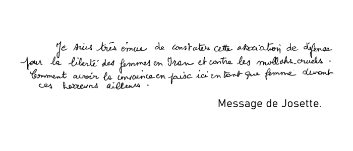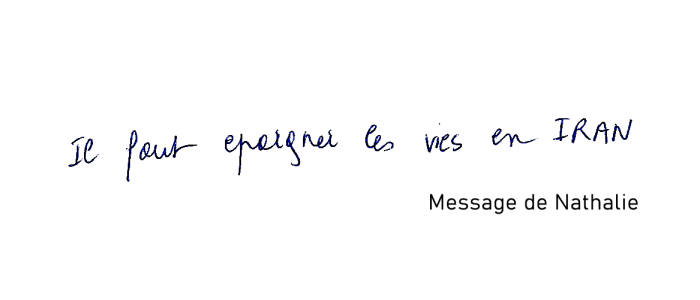 "Pour la liberté et les droits de l'homme en Iran. Nous vous soutenons de tout notre coeur et notre prière d'ici en France !"