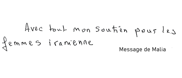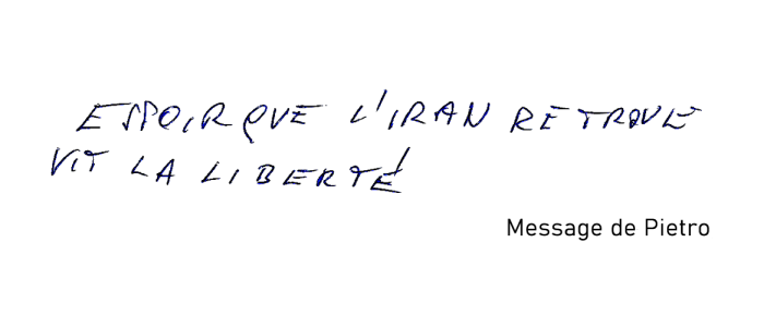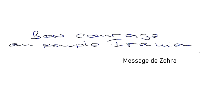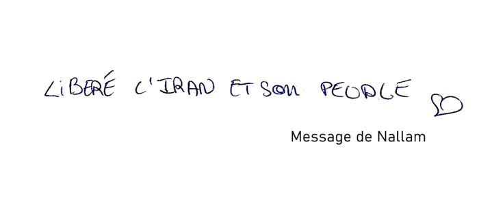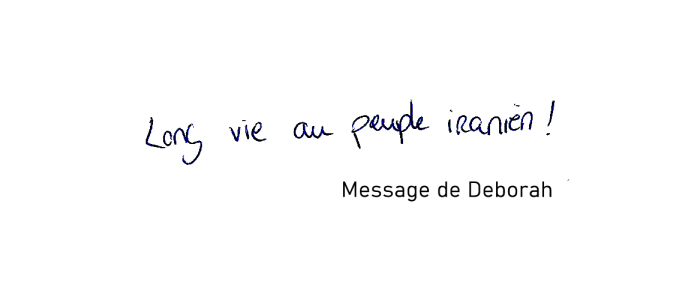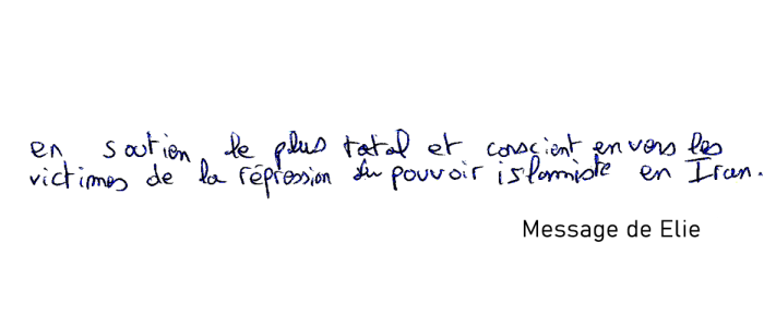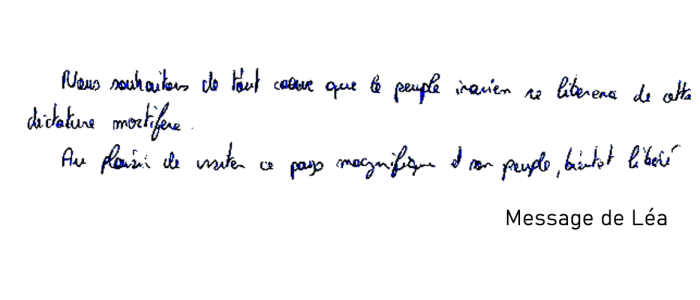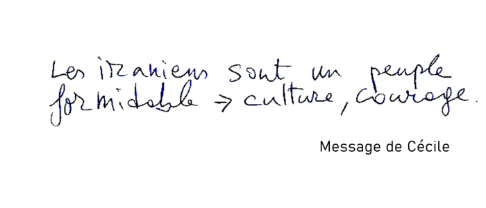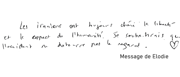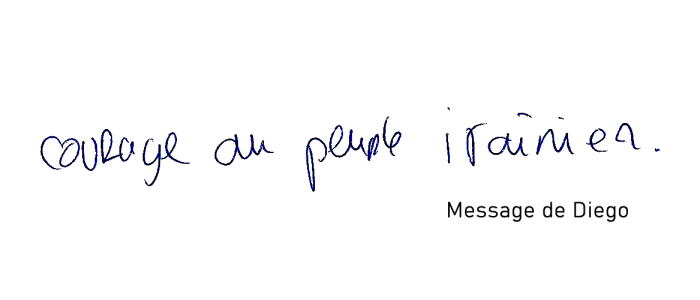"Pour la liberté et la démocratie dans tous les pays, et surtout les plus opprimés. Vive l'amitié entre les peuples. Et vive la jeunesse iranienne libre."