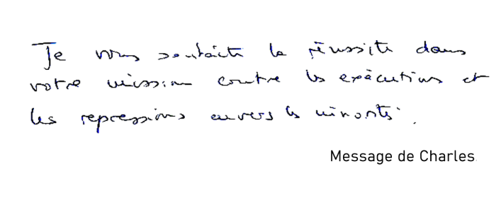 "Je vous souhaite la réussite dans votre mission contre les exécutions et les répressions envers les minorités."